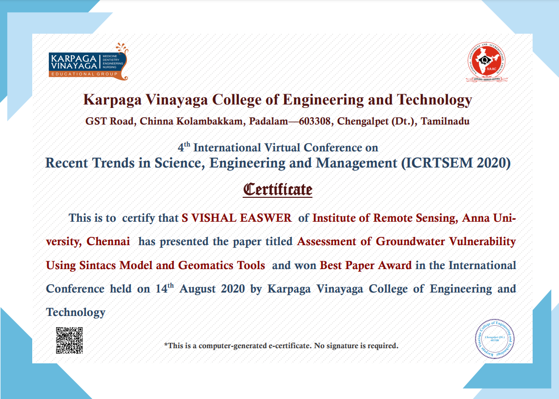 | 16 | Kavinraj A | 19151191135 | Murugasan R | Drought Modelling for Tamilnadu Using Remote Sensing & GIS | JAN 2019 |